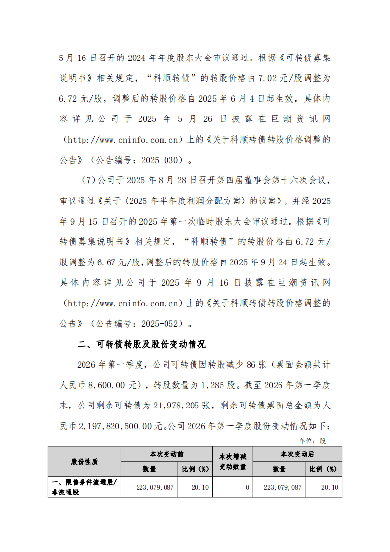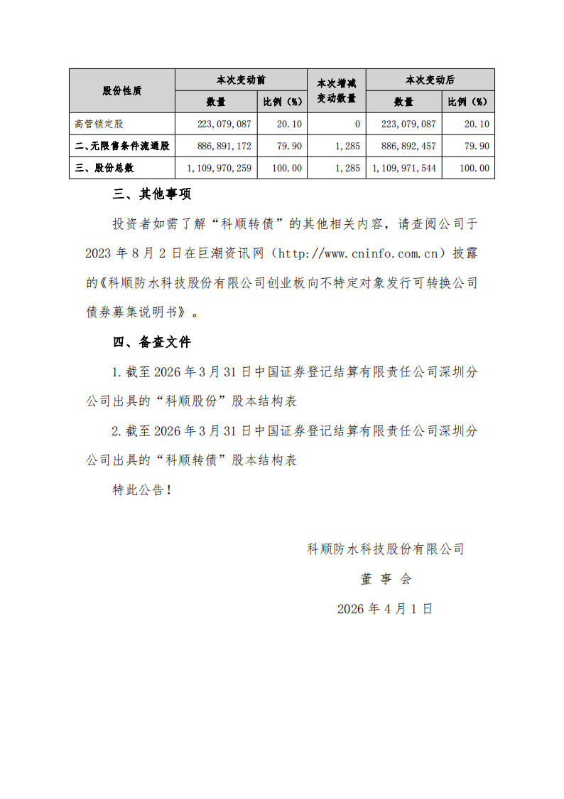 科顺防水科技股份有限公司 关于 2026 年第一季度可转换公司债券转股情况的公告