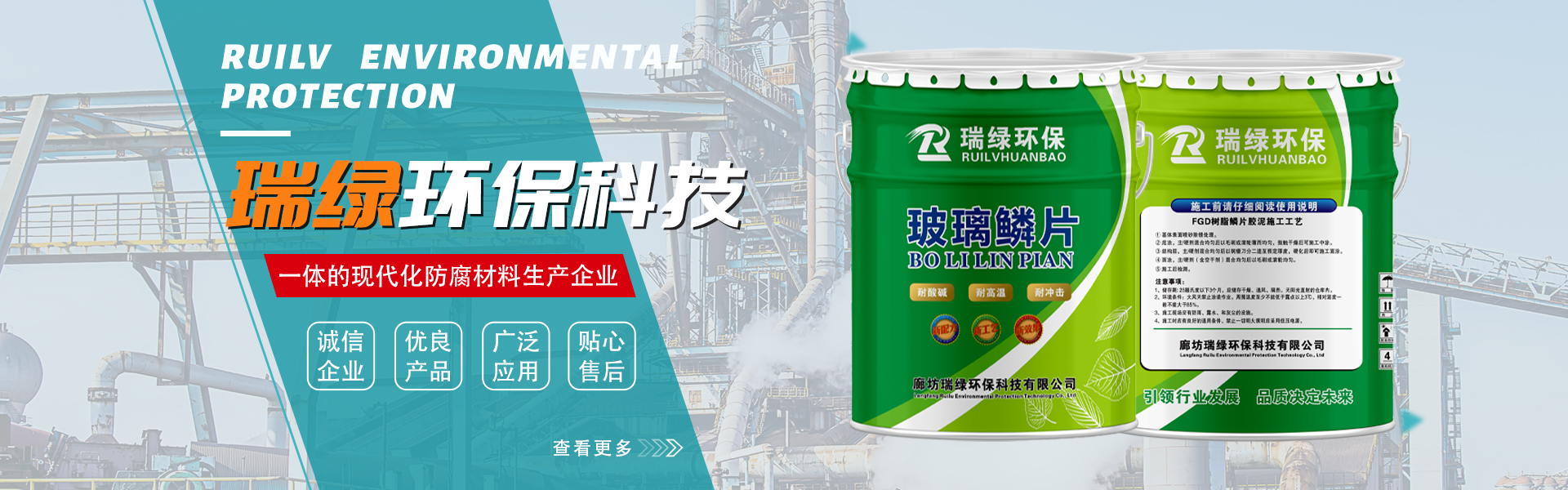 我公司主要生产:乙烯基玻璃鳞片胶泥、环氧玻璃鳞片胶泥、玻璃鳞片漆、环氧玻璃鳞片漆、脱硫塔防腐施工、污水池防腐施工、管道防腐施工、901树脂、907树脂、环氧树脂、固化剂、促进剂等产品。廊坊瑞绿环保科技有限公司具有广泛的耐化学性、极低的气体渗透性、优良的耐热性、耐溶剂性、耐磨性等特点,玻璃鳞片胶泥作为一种先进的防腐材料,广泛应用于燃煤电厂烟气脱硫、电除尘、化工贮罐、石油贮槽内衬、化学反应塔、化工污水池等防腐工程。我公司同时承接现场衬胶防腐、玻璃钢防腐、聚脲防腐等配套防腐工程。公司成立至今,始终坚持以“以质量为中心,以科技为向导”,生产的玻璃鳞片胶泥产品在国内脱硫重防腐领域保持着相当高的声誉和信誉。公司将一如继往地严格保障产品质量,秉承“质量就是企业的生命”的理念,为客户提供优良的防腐蚀材料和施工工程。以良好的信誉、雄厚的技术力量、优良的产品、贴心的售后服务来赢得各界新老用户的信任,欢迎各界新老用户来公司考察和指导。